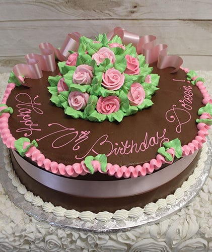 Frosted chocolate buttercream. Bouquet of shades of pink buttercream roses with green leaves. Pink ruffle on top edge. Pink ribbon on top and side.