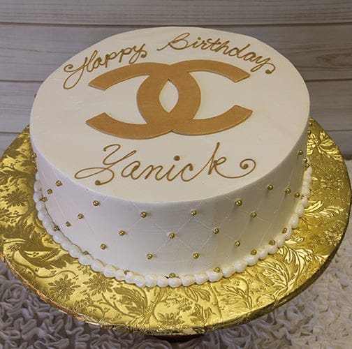White buttercream frosting with gold Chanel logo on top. Quilted design with gold dragees.