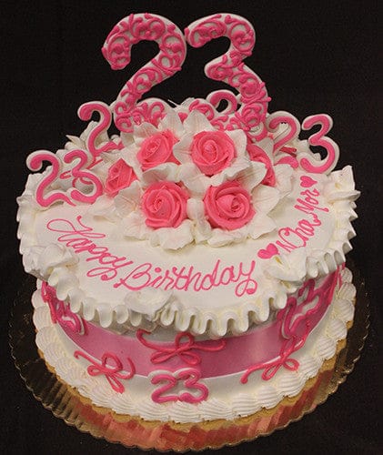 Bouquet of hot pink buttercream roses with white leaves. Hot pink #23 standing on top, side and on top of bouquet. White ruffle border and hot pink ribbon on side.