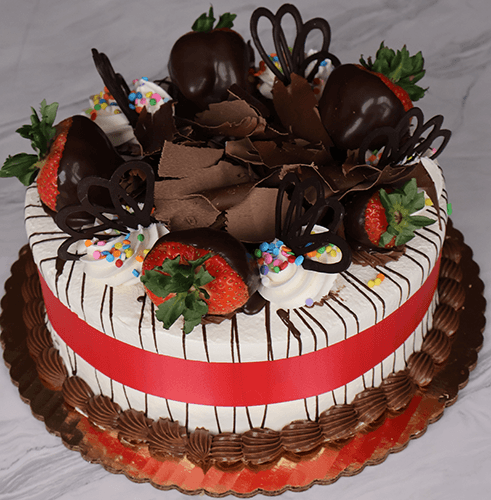 Gold cake filled with fresh strawberries and whipped cream. White buttercream frosting with chocolate drizzle on side. Ring of chocolate covered strawberries alternating chocolate designs with chocolate shavings in the center. Our signature cake!