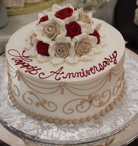 White buttercream frosting with bouquet of red and champagne roses with white leaves, champagne triple swag on side with open scroll with dots underneath