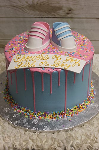 Extra high cake with light blue buttercream and pale pink drip. Pastel confetti all over with one pink sneaker and one blue sneaker on top.