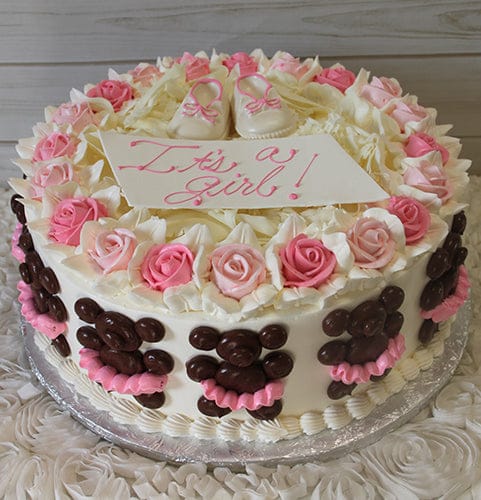 Ring of pink buttercream roses in different shades with white leaves. Chocolate buttercream teddy bears on side with pink tutus. White liquid chocolate booties in center with pink bows and white shaved chocolate.