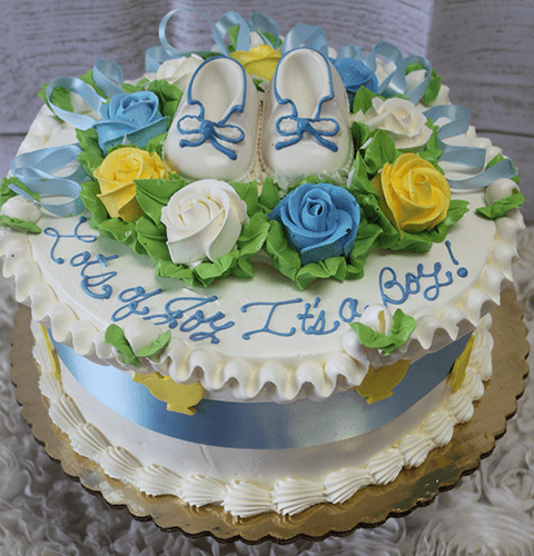 Tight ring of buttercream roses in light blue, yellow, and white with green leaves. Baby shoes with blue laces in center. Blue ribbon and yellow ducks scattered on side.