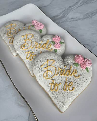 Heart shape Bride to be cookie. Finished with a gold shimmer and pink roses.