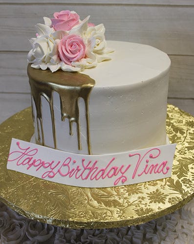 Extra high cake with white buttercream. Gold drip on the side with a bouquet of pink and white buttercream roses.