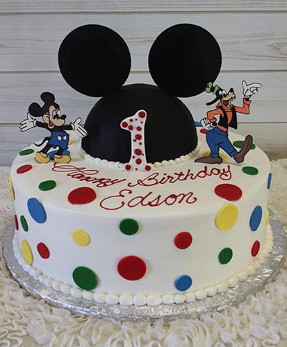 Rolled chocolate Mickey Mouse head. Liquid chocolate Mickey and Goofy on top. Red, blue, green and yellow different size dots all over. Liquid chocolate number standing.