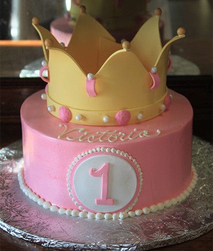Light pink buttercream frosting with number monogram. Yellow rolled chocolate crown on top.