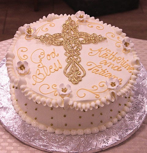 White buttercream frosting. White liquid chocolate Celtic cross painted with gold in center with scattered white sugar cherry blossoms with gold centers. Open scroll on top edge with white ruffle border. Scattered gold dragees on side.