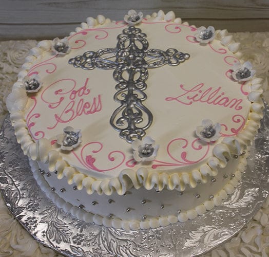 White buttercream frosting with pink trim. White liquid chocolate Celtic cross painted with silver in center with scattered white sugar cherry blossoms with silver centers. Open scroll on top edge with white ruffle border. Scattered silver dragees on side.