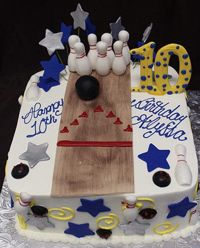 White buttercream frosting, royal blue and silver rolled chocolate stars on wire and scattered on side, liquid chocolate standing bowling pins, bowling balls and standing custom number, rolled chocolate bowling lane with wood grain and red rolled chocolate embellishment, rolled chocolate black 3-D bowling ball, yellow buttercream swirls on side and top edge.