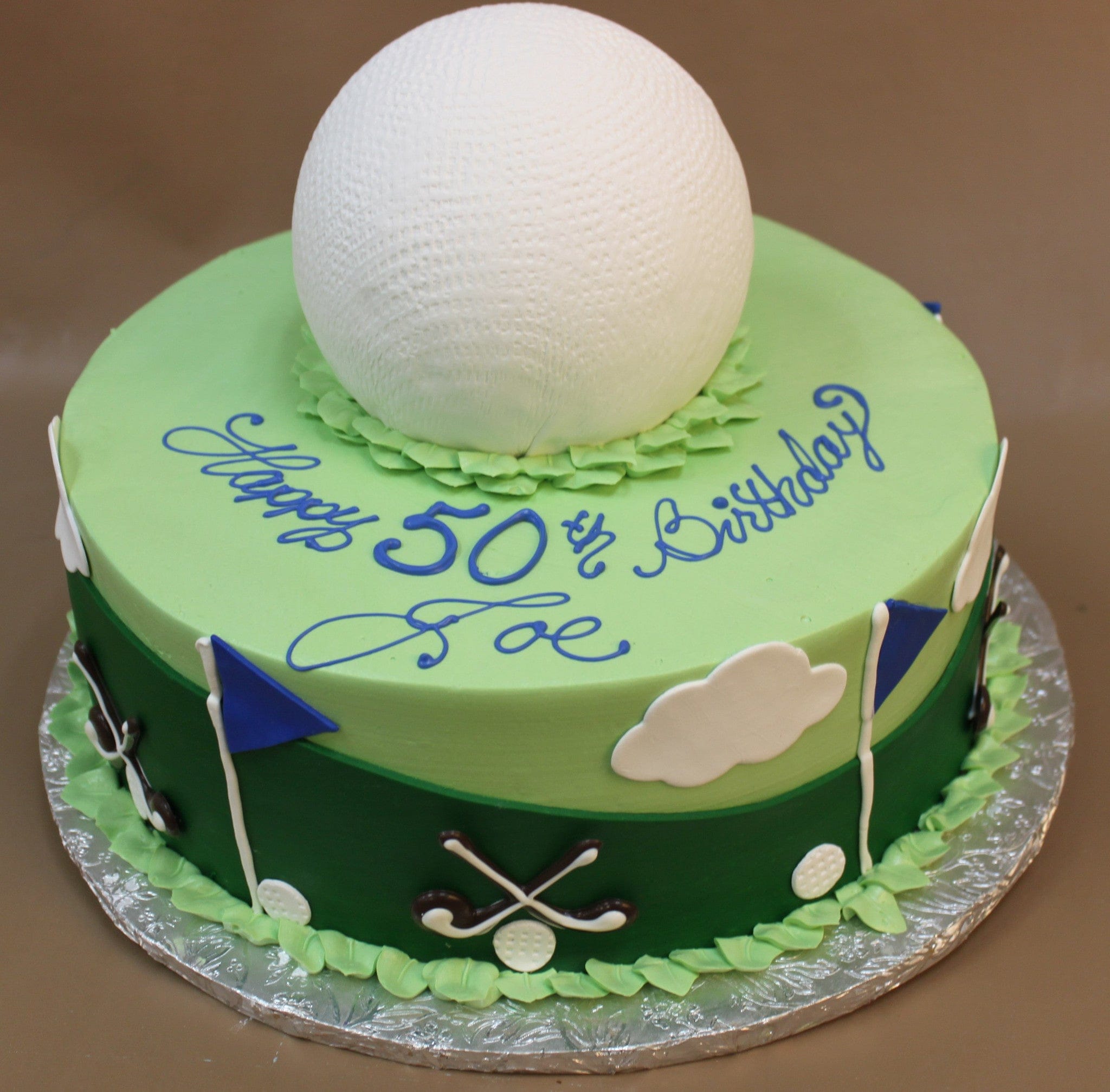 White rolled chocolate covered golf ball, lime green buttercream frost, kelly green rolled chocolate hills, white rolled chocolate clouds and golf balls, royal blue rolled chocolate flags with white buttercream poles, liquid chocolate crossed golf clubs in black with white embellishment, lime green buttercream grass at base