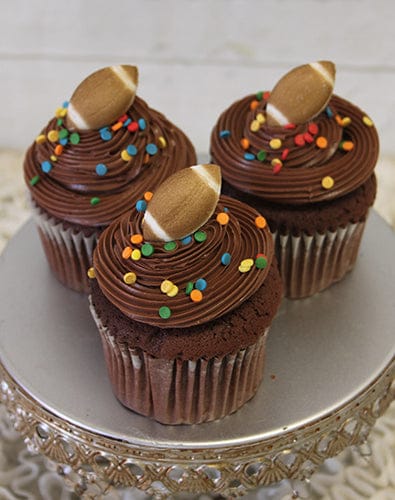 Chocolate buttercream frosting with sugar football and confetti.