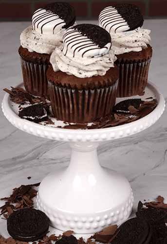 Chocolate cupcake filled with oreo mousse and topped with oreo whipped cream and a chocolate covered oreo.