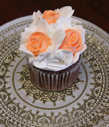 Cupcake with three mini peach buttercream roses with white leaves.