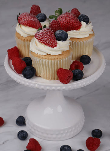 Gold cupcake with tres leches filling. Garnished with whipped cream and fresh fruit.