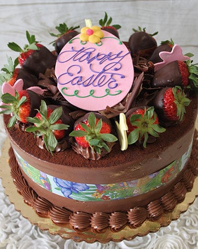 Chocolate buttercream frosting with coco on top and chocolate dipped strawberries. Gold cake with mascarpone mousse and coffee flavor. Easter decor.
