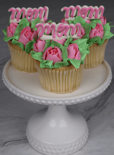 Gold cupcake filled with chocolate mouse. Garnished with pink tulip design and standing chocolate MOM.