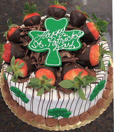 White frosting with dark chocolate drizzle. Dark chocolate dipped strawberries with chocolate shavings. Green shamrock decorations on top.