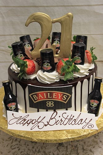 White buttercream frosting with a ganache drip. Gold number standing with a ring of Bailey’s nips alternating with milk dipped strawberries. Bailey’s logo on side. Nips provided by our distributor “Wollaston Liquors”. Must be 21 to order and provide I.D. upon pick up.