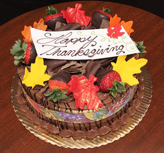 Chocolate cake with chocolate mousse filling with chocolate buttercream frosting. Ring of fall leaves and chocolate covered strawberries. Dark chocolate drizzle on side with fall ribbon.