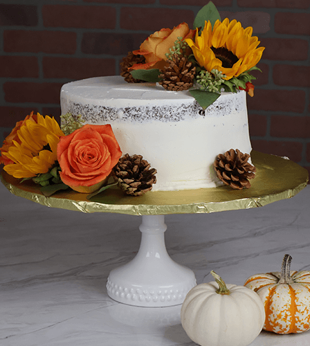 Semi naked cake with fall fresh flowers, sunflowers and pinecones.