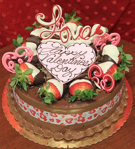 Chocolate buttercream frosting with a ring of white and dark chocolate dipped strawberries. Valentines themed decorations. Tiramisu cake.