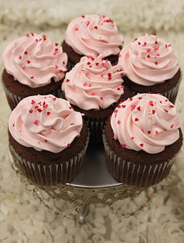 Chocolate cupcakes with white chocolate mousse filling. Pink buttercream frosting with valentine sprinkles.